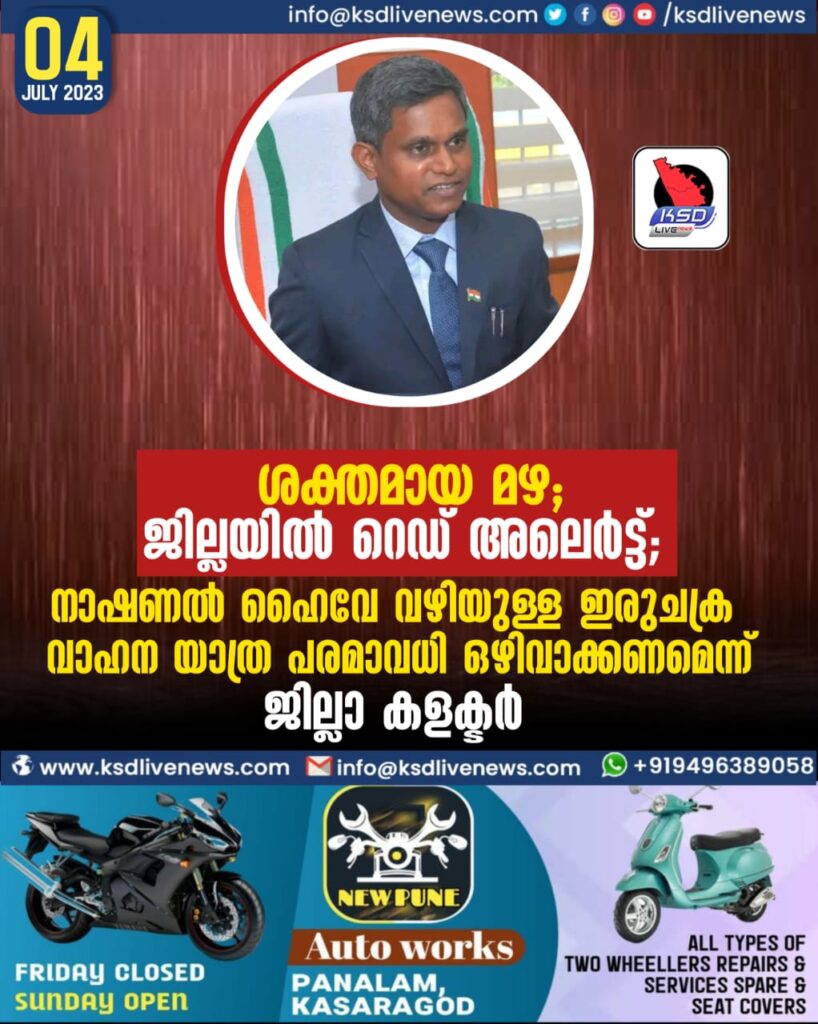 ശക്തമായ മഴ; ജില്ലയിൽ റെഡ് അലെർട്ട്; ദേശീയപാതയിൽ വെള്ളക്കെട്ടുകൾ രൂക്ഷം; നാഷണൽ ഹൈവേ വഴിയുള്ള ഇരുചക്ര വാഹന യാത്ര പരമാവധി ഒഴിവാക്കണമെന്ന് ജില്ലാ കളക്ടർ