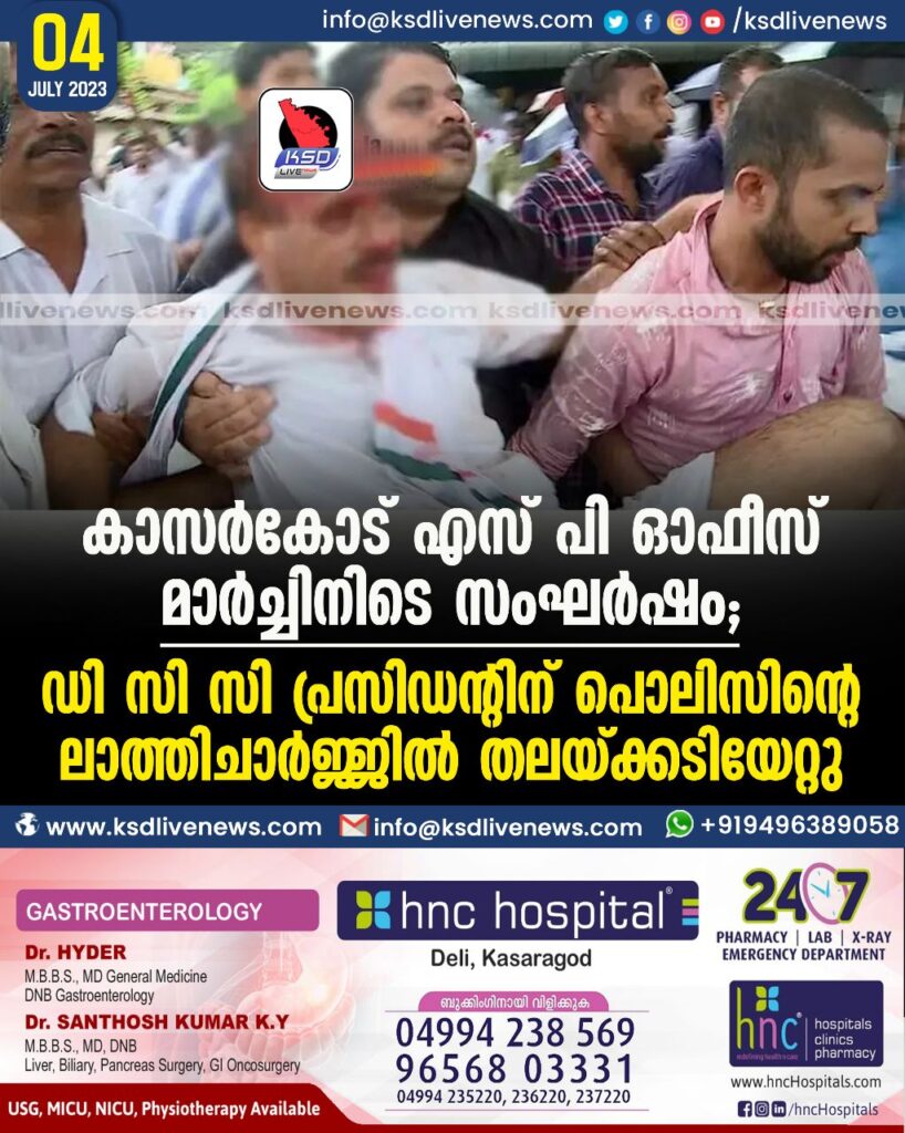കാസര്കോട് എസ് പി ഓഫീസ് മാര്ച്ചിനിടെ സംഘര്ഷം: ഡി സി സി പ്രസിഡന്റിന് പൊലിസിന്റെ ലാത്തിചാര്ജ്ജില് തലയ്ക്കടിയേറ്റു