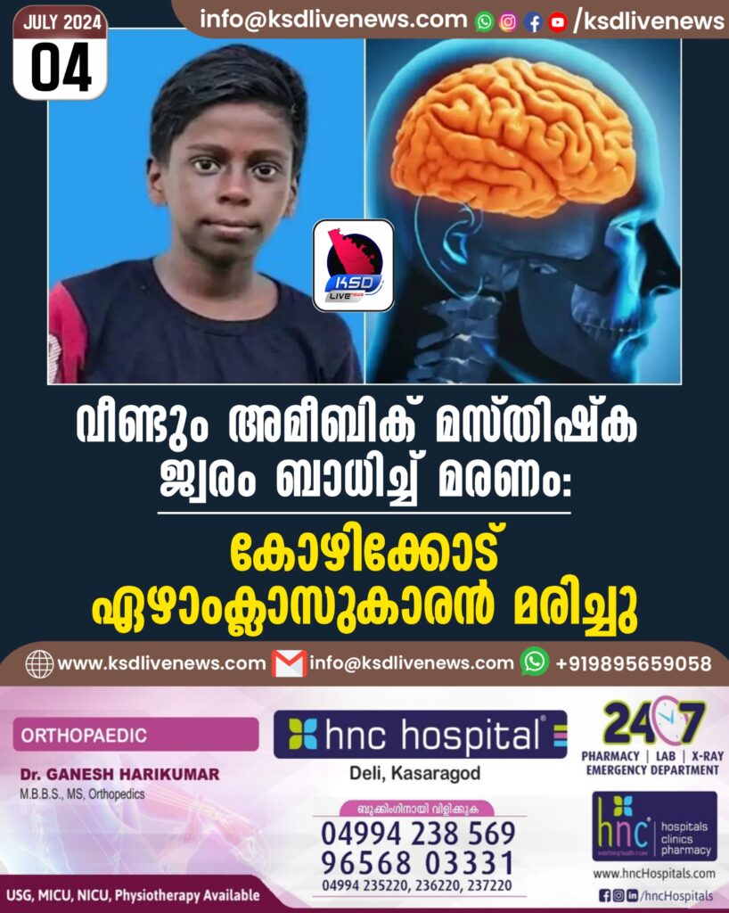 വീണ്ടും അമീബിക് മസ്തിഷ്ക ജ്വരം ബാധിച്ച്‌ മരണം: കോഴിക്കോട് ഏഴാംക്ലാസുകാരന്‍ മരിച്ചു