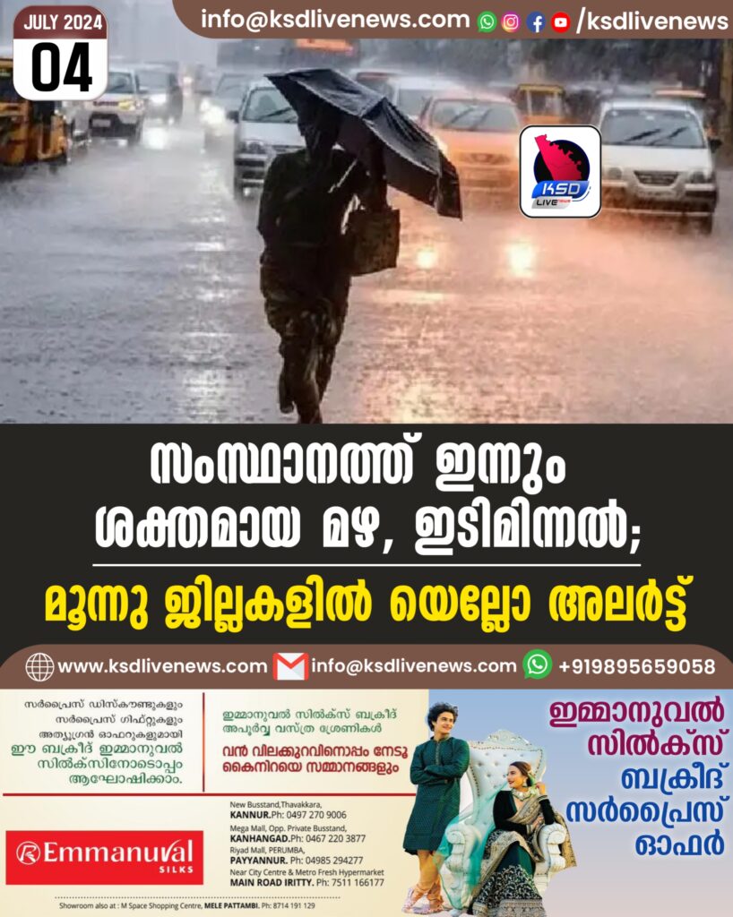 സംസ്ഥാനത്ത് ഇന്നും ശക്തമായ മഴ, ഇടിമിന്നല്; മൂന്നു ജില്ലകളില് യെല്ലോ അലര്ട്ട്
