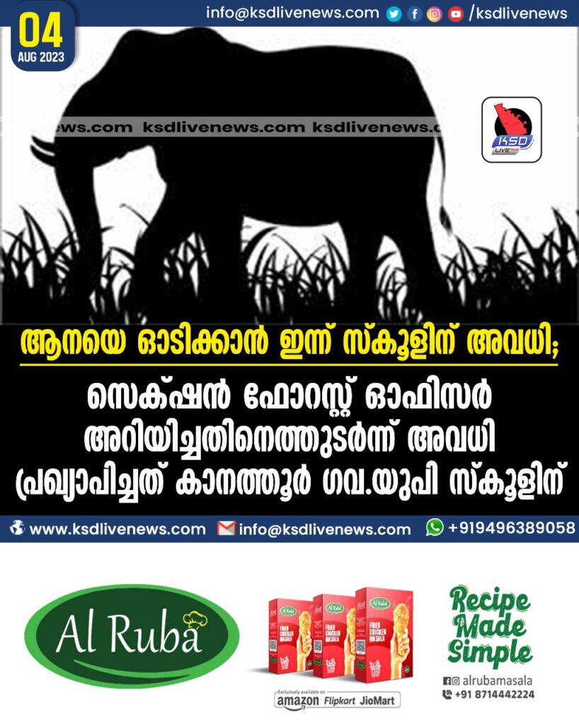 ആനയെ ഓടിക്കാൻ ഇന്ന് സ്കൂളിന് അവധി; സെക്ഷൻ ഫോറസ്റ്റ് ഓഫിസർ അറിയിച്ചതിനെത്തുടർന്ന് അവധി പ്രഖ്യാപിച്ചത് കാനത്തൂർ ഗവ.യുപി സ്കൂളിന്