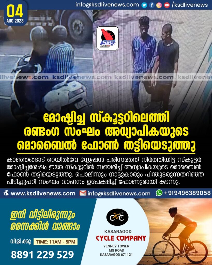 കാഞ്ഞങ്ങാട്: കാഞ്ഞങ്ങാട് റെയിൽവേ സ്റ്റേഷൻ പരിസരത്ത് നിർത്തിയിട്ട സ്കൂട്ടർ മോഷ്ടിച്ചശേഷം ഇതേ സ്കൂട്ടറിൽ സഞ്ചരിച്ച് അധ്യാപികയുടെ മൊബൈൽ ഫോൺ തട്ടിയെടുത്തു. പൊലീസും നാട്ടുകാരും പിന്തുടരുന്നതറിഞ്ഞ പിടിച്ചുപറി സംഘം വാഹനം ഉപേക്ഷിച്ച് ഫോണുമായി കടന്നു. ചെമ്മട്ടംവയൽ തോയമ്മലിലെ അബ്ദുൽ അസീസിന്റെ കെ.എൽ 60 -ഡി 7184 ആക്ടീവ സ്കൂട്ടറാണ് കഴിഞ്ഞ ദിവസം കാണാതായത്. സ്റ്റേഷന്റെ കിഴക്കുഭാഗത്തെ റോഡരികിലാണ് നിർത്തിയിട്ടിരുന്നത്. രാവിലെ 6 .25 വൈകിട്ട് 6. 45 നു മിടയിലാണ് സംഭവം. 25 000 രൂപ വില വരുന്ന സ്കൂട്ടറാണ് മോഷണം പോയത്. ഹോസ് ദുർഗ് പൊലീസ് സംഭവത്തിൽ അന്വേഷണം നടത്തുന്നതിനിടെയാണ് ബേക്കൽപൊലീസ് അതിർത്തിയിൽ പിടിച്ചു പറി നടന്നത്. ബസ് കാത്തിരിപ്പ് കേന്ദ്രത്തിൽ ഇരിക്കുകയായിരുന്ന യു.പി സ്കൂൾ അധ്യാപിക തൃക്കരിപ്പൂർ കാറോളം മെനോക്ക പുതിയപുരയിൽ ഹൗസിൽ പി.പി. ഷൈമയുടെ മൊബൈൽ ഫോണാണ് സ്കൂട്ടറിലെത്തിയ രണ്ടംഗ സംഘം തട്ടിയെടുത്ത് രക്ഷപ്പെട്ടത്. കോട്ടിക്കുളം ബസ് കാത്തിരിപ്പ് കേന്ദ്രത്തിൽ വെച്ചാണ് മോഷ്ടിച്ചത്. 15500 രൂപ വില വരുന്ന ഫോണാണ് തട്ടിയെടുത്തത്. അധ്യാപിക ബഹളമുണ്ടാക്കിയപ്പോൾ നാട്ടുകാർ ഓടിയെത്തി. പൊലീസിനും വിവരം നൽകി. പൊലീസ് പിന്നാലെയുണ്ടെന്ന് മനസ്സിലാക്കിയ സംഘം സ്കൂട്ടർ ഇടവഴിയിൽ ഉപേക്ഷിച്ച് രക്ഷപ്പെടുകയായിരുന്നു. സ്കൂട്ടർ പൊലീസ് കസ്റ്റഡിയിലെടുത്ത് പരിശോധിച്ചതിലാണ് കാഞ്ഞങ്ങാട്ട് നിന്നും മോഷണം പോയതാണെന്നറിഞ്ഞത്. സംഘം സ്കൂട്ടറിൽ സഞ്ചരിക്കുന്നതിന്റെയും റെയിൽവേ സ്റ്റേഷനിലേക്ക് സ്കൂട്ടർ മോഷ്ടിക്കാനെത്തുന്നതിന്റെയും രണ്ട് സി.സി.ടി.വി ദൃശ്യങ്ങൾ പൊലീസ് ശേഖരിച്ചു. അധ്യാപികയുടെ പരാതിയിൽ കണ്ടാലറിയാവുന്ന രണ്ടു പേർക്കെതിരെ ബേക്കൽ പൊലീസ് കേസെടുത്തു.