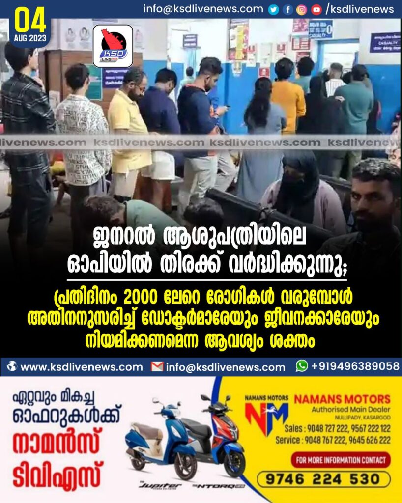കാസര്കോട്: ജെനറല് ആശുപത്രിയില് രോഗികളെ കൊണ്ട് നിറയുന്നു. 2000 ലധികം രോഗികളാണ് ഒരു ദിവസം കാസര്കോട് ജെനറല് ആശുപത്രിയില് എത്തുന്നതെന്നാണ് കണക്ക്.
