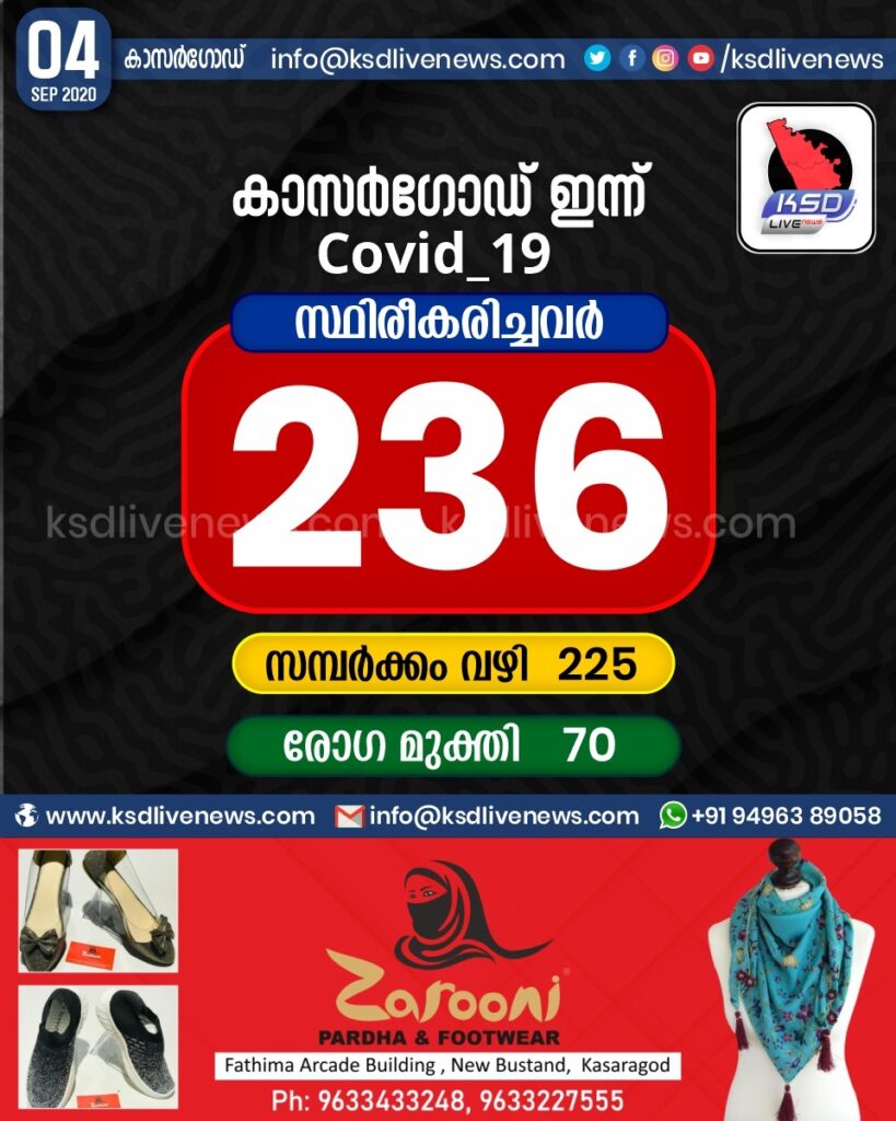 കാസർഗോഡ് ജില്ലയിൽ ഇന്ന് 236 പേർക്ക് കോവിഡ് സ്ഥിരീകരിച്ചു. സമ്പർക്കം വഴി 225 പേർക്കും. 70 പേർക്ക് രോഗ മുക്തി