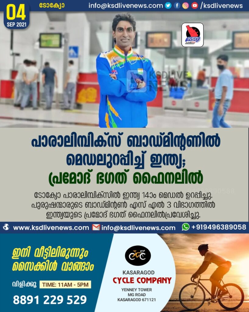 ടോക്യോ: ടോക്യോ പാരാലിമ്പിക്സിൽ ഇന്ത്യ 14-ാം മെഡൽ ഉറപ്പിച്ചു. പുരുഷന്മാരുടെ ബാഡ്മിന്റൺ എസ് എൽ 3 വിഭാഗത്തിൽ ഇന്ത്യയുടെ പ്രമോദ് ഭഗത് ഫൈനലിൽ പ്രവേശിച്ചു.