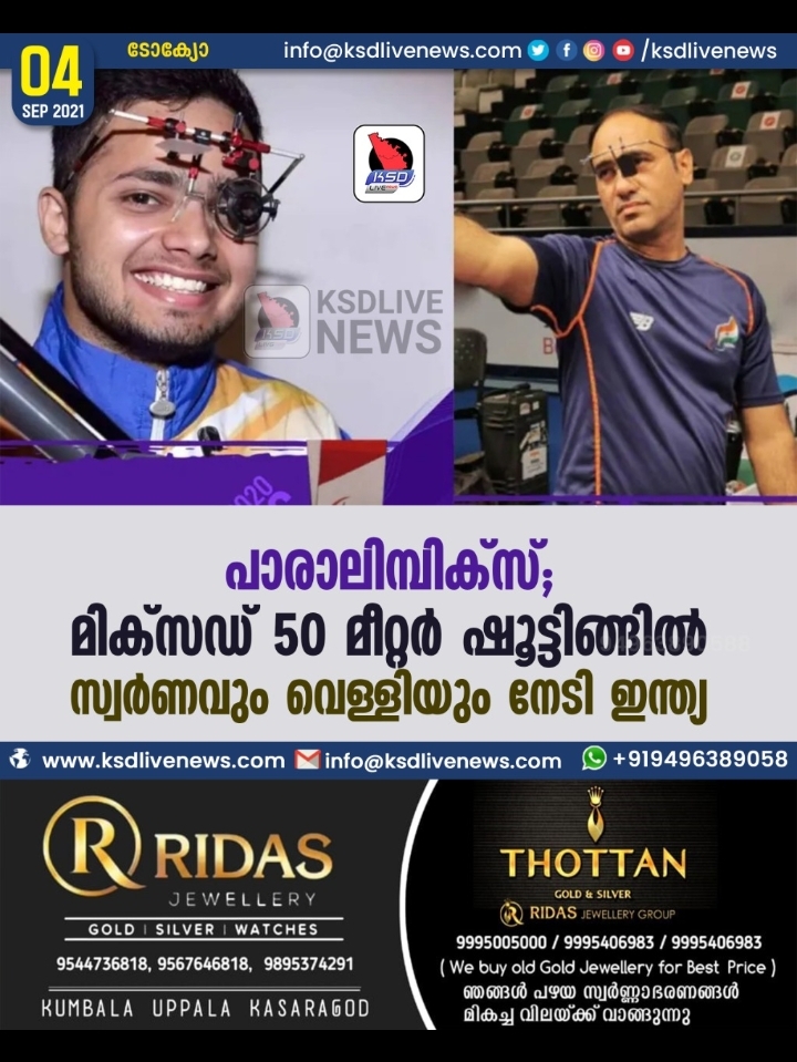പാരാലിമ്പിക്സ്: മിക്സഡ് 50 മീറ്റര് ഷൂട്ടിങ്ങില് സ്വര്ണവും വെള്ളിയും നേടി ഇന്ത്യ