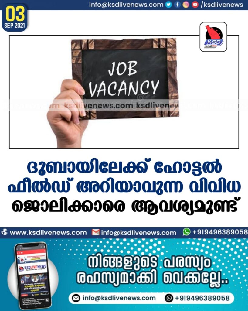 ദുബായിലേക്ക് ഹോട്ടൽ ഫീൽഡ് അറിയാവുന്ന വിവിധ ജൊലിക്കാരെ ആവശ്യമുണ്ട്
