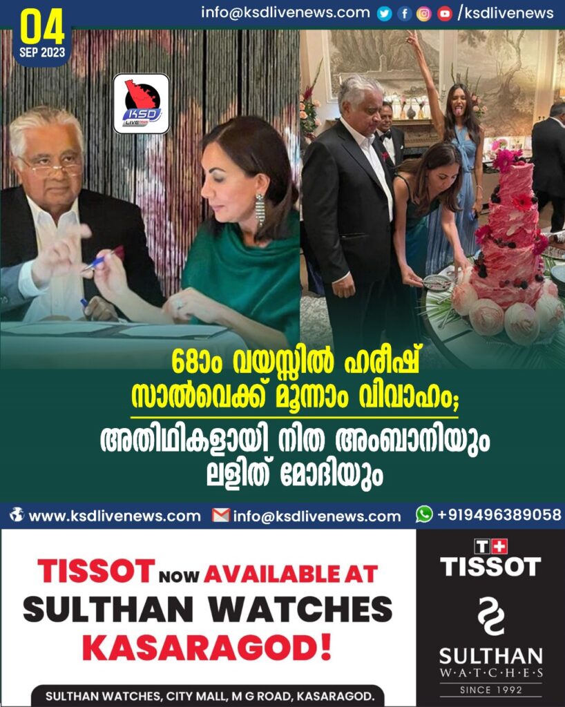 68ാം വയസ്സില് ഹരീഷ് സാല്വെക്ക് മൂന്നാം വിവാഹം; അതിഥികളായി നിത അംബാനിയും ലളിത് മോദിയും