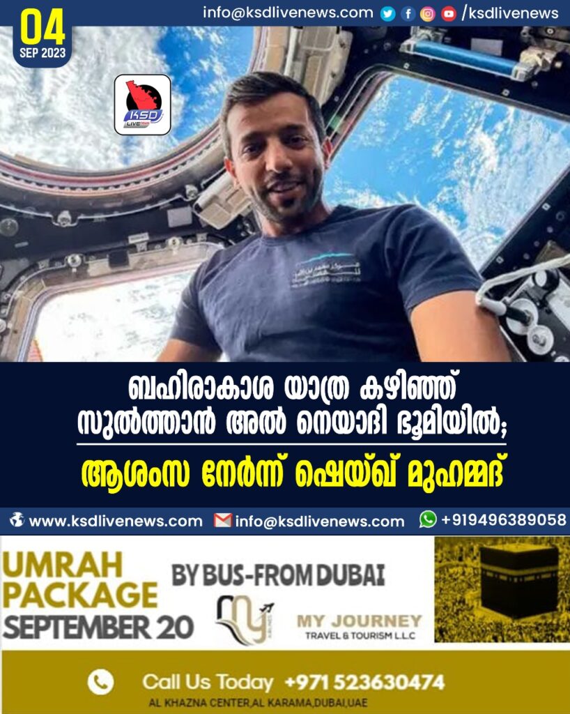 ബഹിരാകാശ യാത്ര കഴിഞ്ഞ് സുല്ത്താൻ അല് നെയാദി ഭൂമിയില്; ആശംസ നേര്ന്ന് ഷെയ്ഖ് മുഹമ്മദ്