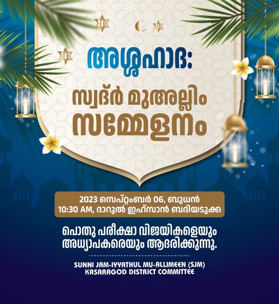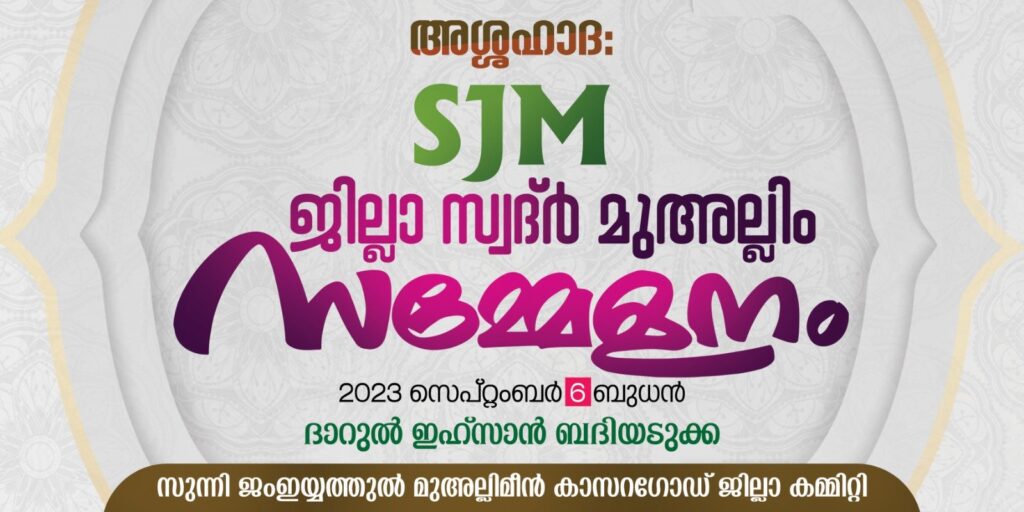 സുന്നി ജംജയ്യത്തുൽ മുഅല്ലിമീൻ (SJM) കാസറഗോഡ് ജില്ലാ കമ്മിറ്റി അശ്ശഹാദ:സ്വദ്ർ മുഅല്ലിം സമ്മേളനം സംഘടിപ്പിക്കുന്നു.