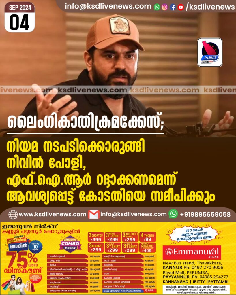 ലൈംഗികാതിക്രമക്കേസ്; നിയമ നടപടിക്കൊരുങ്ങി നിവിൻ പോളി, എഫ്ഐആർ റദ്ദാക്കണമെന്ന് ആവശ്യപ്പെട്ട് കോടതിയെ സമീപിക്കും