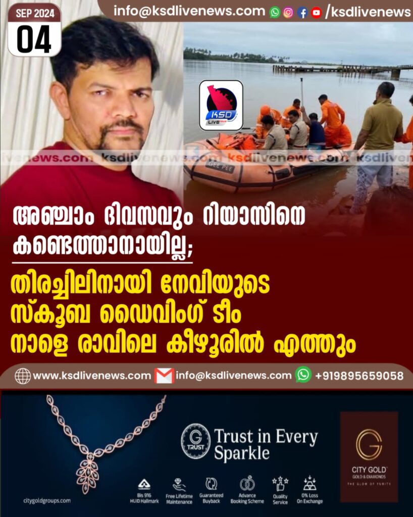 അഞ്ചാം ദിവസവും റിയാസിനെ കണ്ടെത്താനായില്ല; തിരച്ചിലിനായി നേവിയുടെ സ്കൂബ ഡൈവിംഗ് ടീം നാളെ രാവിലെ കീഴൂരിൽ എത്തും