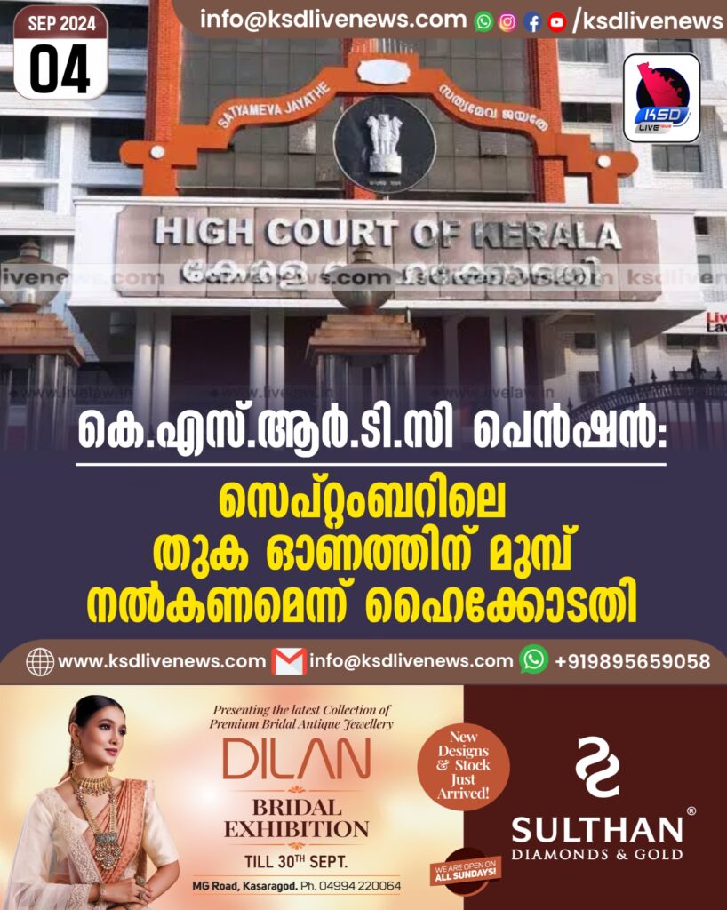 കെ.എസ്.ആർ.ടി.സി. പെൻഷൻ; സെപ്റ്റംബറിലെ തുക ഓണത്തിന് മുമ്പ് നൽകണമെന്ന് ഹൈക്കോടതി