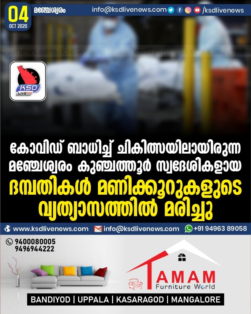 കോവിഡ് ബാധിച്ച് ചികിത്സയിലായിരുന്ന മഞ്ചേശ്വരം കുഞ്ചത്തൂർ സ്വദേശികളായ ദമ്പതികൾ മണിക്കൂറുകളുടെ വ്യത്യാസത്തിൽ മരിച്ചു