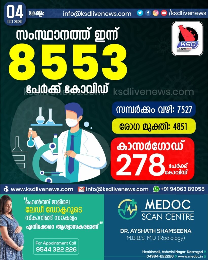 സംസ്ഥാനത്ത് ഇന്നും എട്ടായിരം കടന്ന് കോവിഡ് ; സംസ്ഥാനത്ത് ഇന്ന് 8553 പേർക്ക് കോവിഡ് സ്ഥിരീകരിച്ചു. സമ്പർക്കം വഴി 7527 പേർക്കും.രോഗ മുക്തി 4851 പേർക്കും. കാസർഗോഡ് ജില്ലയിൽ ഇന്ന് 278 പേർക്ക് കോവിഡ് സ്ഥിരീകരിച്ചു. മരണം 23