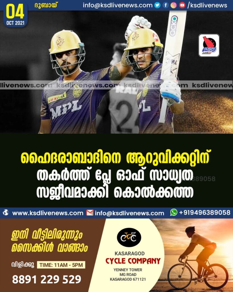 ഹൈദരാബാദിനെ ആറുവിക്കറ്റിന് തകര്‍ത്ത് പ്ലേ ഓഫ് സാധ്യത സജീവമാക്കി കൊല്‍ക്കത്ത