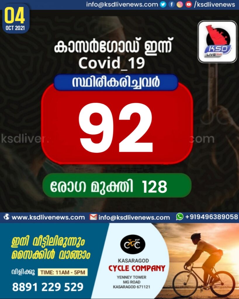 കാസർഗോഡ് ജില്ലയിൽ ഇന്ന് 92 പേർക്ക് കോവിഡ് സ്ഥിരീകരിച്ചു. 128 പേർക്ക് രോഗമുക്തി
