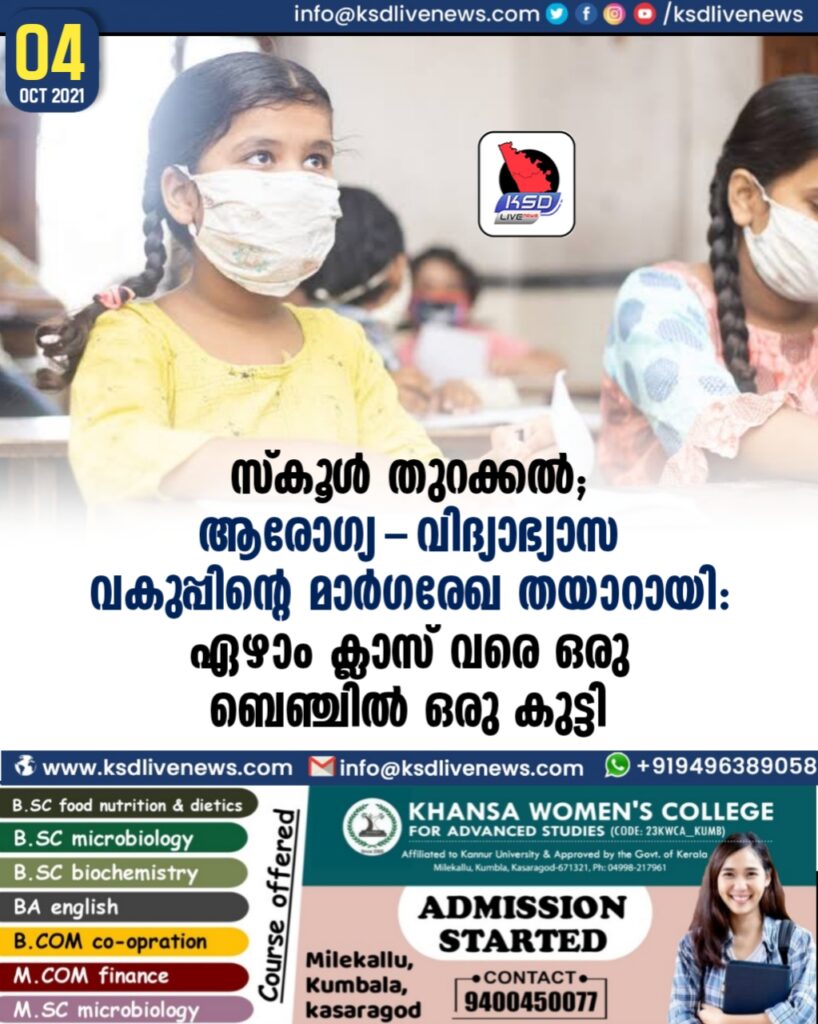 സ്കൂള് തുറക്കല്; ആരോഗ്യ -വിദ്യാഭ്യാസ വകുപ്പിന്റെ മാര്ഗരേഖ തയാറായി: ഏഴാം ക്ലാസ് വരെ ഒരു ബെഞ്ചില് ഒരു കുട്ടി