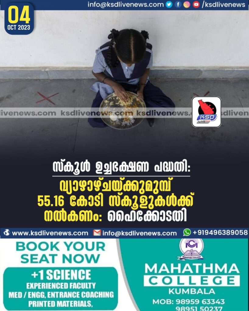സ്കൂൾ ഉച്ചഭക്ഷണ പദ്ധതി: വ്യാഴാഴ്ചയ്ക്കുമുമ്പ് 55.16 കോടി സ്കൂളുകൾക്ക് നൽകണം -ഹൈക്കോടതി,