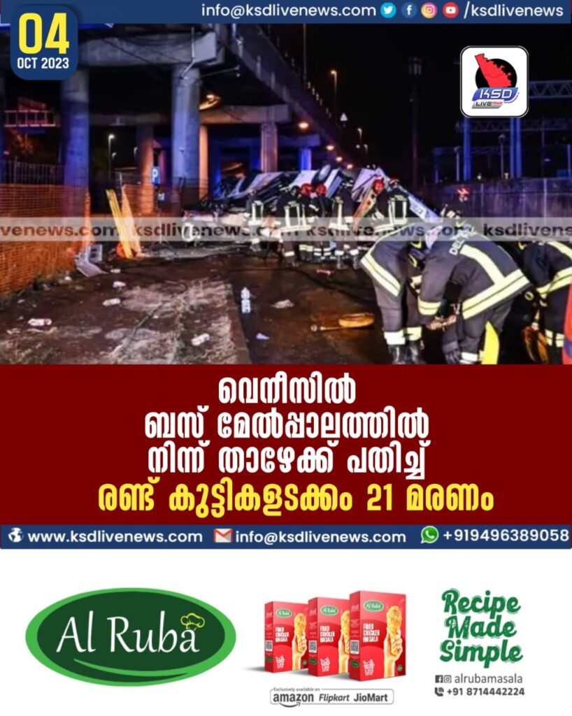 വെനീസില്‍ ബസ് മേല്‍പ്പാലത്തില്‍ നിന്ന് താഴേക്ക് പതിച്ച്‌ രണ്ട് കുട്ടികളടക്കം 21 മരണം