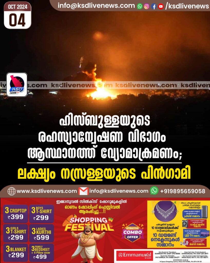 ഹിസ്ബുള്ളയുടെ രഹസ്യാന്വേഷണ വിഭാഗം ആസ്ഥാനത്ത് വ്യോമാക്രമണം; ലക്ഷ്യം നസ്രള്ളയുടെ പിന്ഗാമി