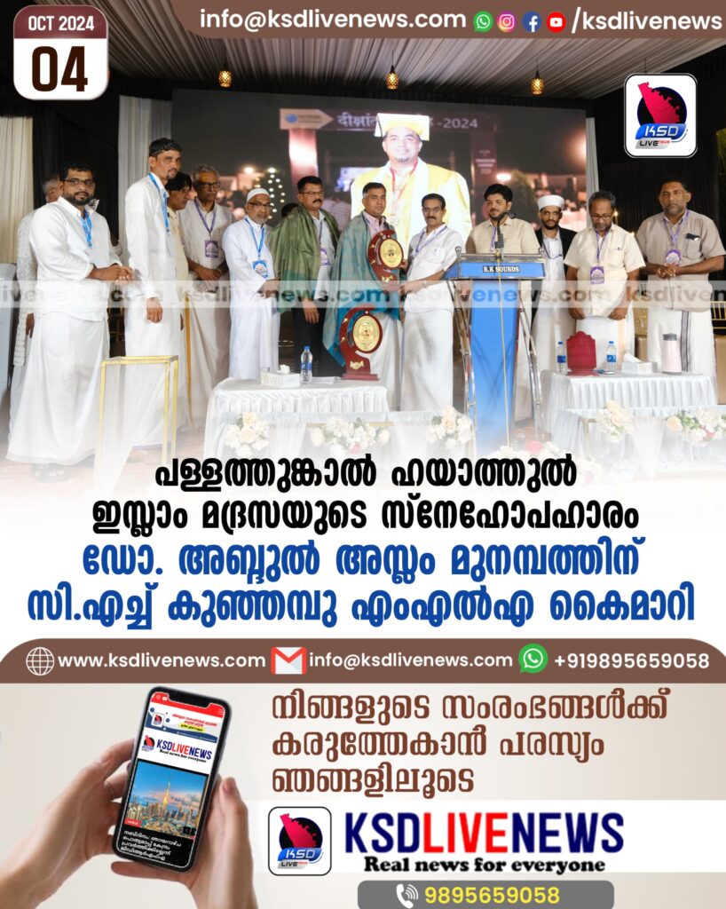ചട്ടഞ്ചാൽ: പള്ളത്തുങ്കാൽ ഹയാത്തുൽ ഇസ്ലാം മദ്രസക്ക് വേണ്ടി പുതിയതായി നിർമ്മിച്ച കെട്ടിടോൽഘാടന പരിപാടിയോടനുബന്ധിച്ച് സംഘടിപ്പിച്ച സാംസ്കാരിക സമ്മേളനത്തിൽ സാമൂഹിക പ്രവർത്തകനും യു.ജി.സി അംഗീകൃത എൻ.ഐ.ആർ.എഫ് റാങ്കുള്ള ഇന്ത്യയിലെ പ്രശസ്ത യൂണിവേഴ്സിറ്റി ആയ ഗ്ലോക്കൽ യൂണിവേഴ്സിറ്റിയിൽ നിന്ന് ഓണററി നിന്ന് ഡോക്ടറേറ്റ് ലഭിച്ച ഡോ. അബ്ദുൽ അസ്ലം മുനമ്പത്തിനെ സി എച്ച് കുഞ്ഞമ്പു എംഎൽഎ അനുമോദിച്ചു. ചടങ്ങിൽ ജില്ലാ പഞ്ചായത്ത് വൈസ് പ്രസിഡണ്ട് ഷാനവാസ് പാദൂർ, ചെമ്മനാട് ഗ്രാമപഞ്ചായത്ത് വൈസ് പ്രസിഡണ്ട് മൻസൂർ ഗുരുക്കൾ, വാർഡ് മെമ്പർ നിസാർ ടി പി, ഗോപിനാഥൻ പന്നിക്കൽ, കൃഷ്ണൻ നായർ പള്ളത്തുങ്കാൽ, ജുനൈദ് അംജതി, സുകുമാരൻ നായർ, മറ്റു കമ്മിറ്റി ഭാരവാഹികൾ, മഹൽ നിവാസികൾ തുടങ്ങിയവർ സംബന്ധിച്ചു.