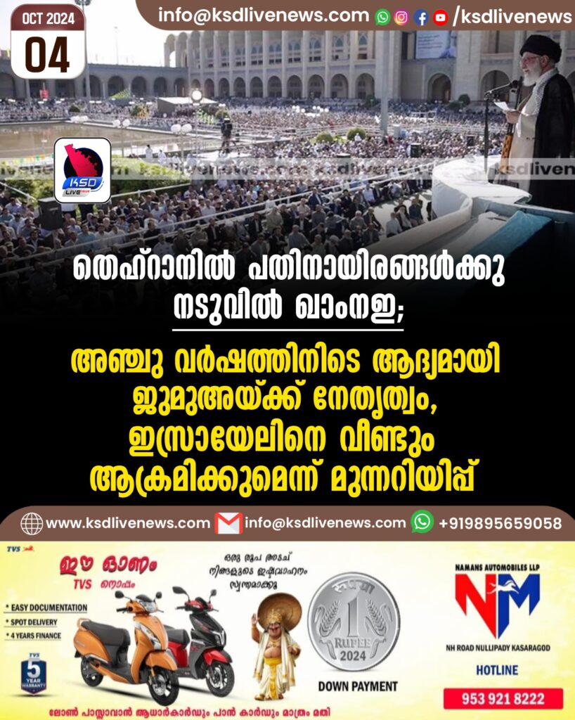 തെഹ്റാനില് പതിനായിരങ്ങള്ക്കു നടുവില് ഖാംനഇ; അഞ്ചു വർഷത്തിനിടെ ആദ്യമായി ജുമുഅയ്ക്ക് നേതൃത്വം, ഇസ്രായേലിനെ വീണ്ടും ആക്രമിക്കുമെന്ന് മുന്നറിയിപ്പ്