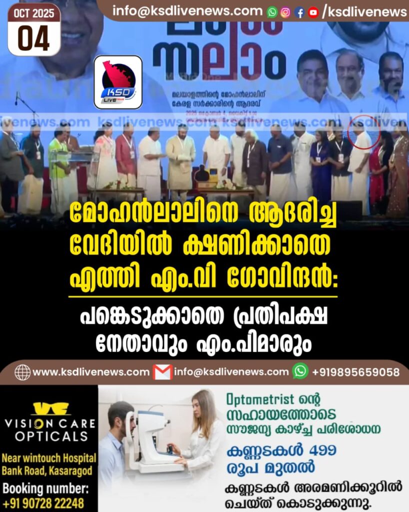 മോഹൻലാലിനെ ആദരിച്ച വേദിയിൽ ക്ഷണിക്കാതെ എത്തി എം.വി ഗോവിന്ദൻ: പങ്കെടുക്കാതെ പ്രതിപക്ഷ നേതാവും എംപിമാരും
