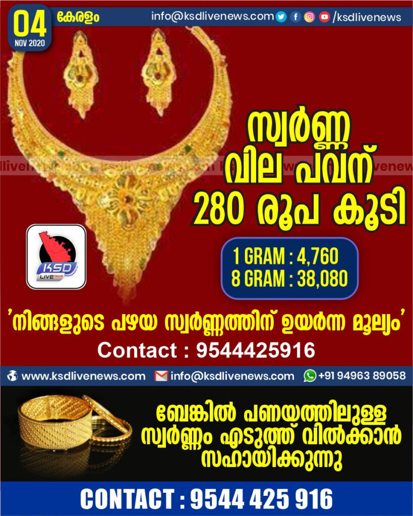 അതേസമയം, ആഗോള വിപണിയിൽ സ്പോട്ട് ഗോൾഡ് വില 0.8ശതമാനം കുറഞ്ഞ് 1,894.33 ഡോളർ നിലവാരത്തിലെത്തി. യുഎസ് തിരഞ്ഞെടുപ്പിന്റെ ആദ്യഘട്ട ഫലങ്ങൾ പുറത്തുവന്നതിനെതുടർന്നാണ് സ്വർണവിലയിൽ നേരിയ ഇടിവുണ്ടായത്.