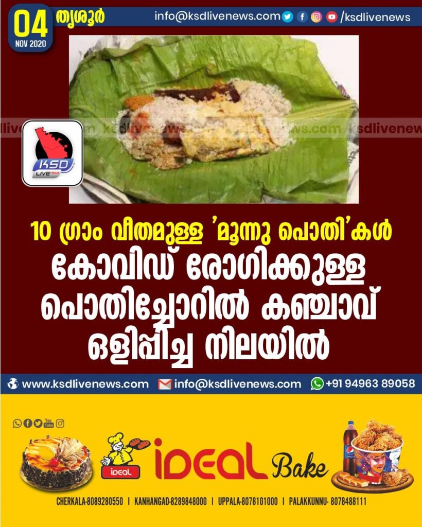 10 ഗ്രാം വീതമുള്ള ‘ മൂന്നു പൊതി’കൾ ; കോവിഡ് രോ ഗിക്കുള്ള പൊതിച്ചോറിൽ കഞ്ചാവ് ഒളിപ്പിച്ച നിലയിൽ