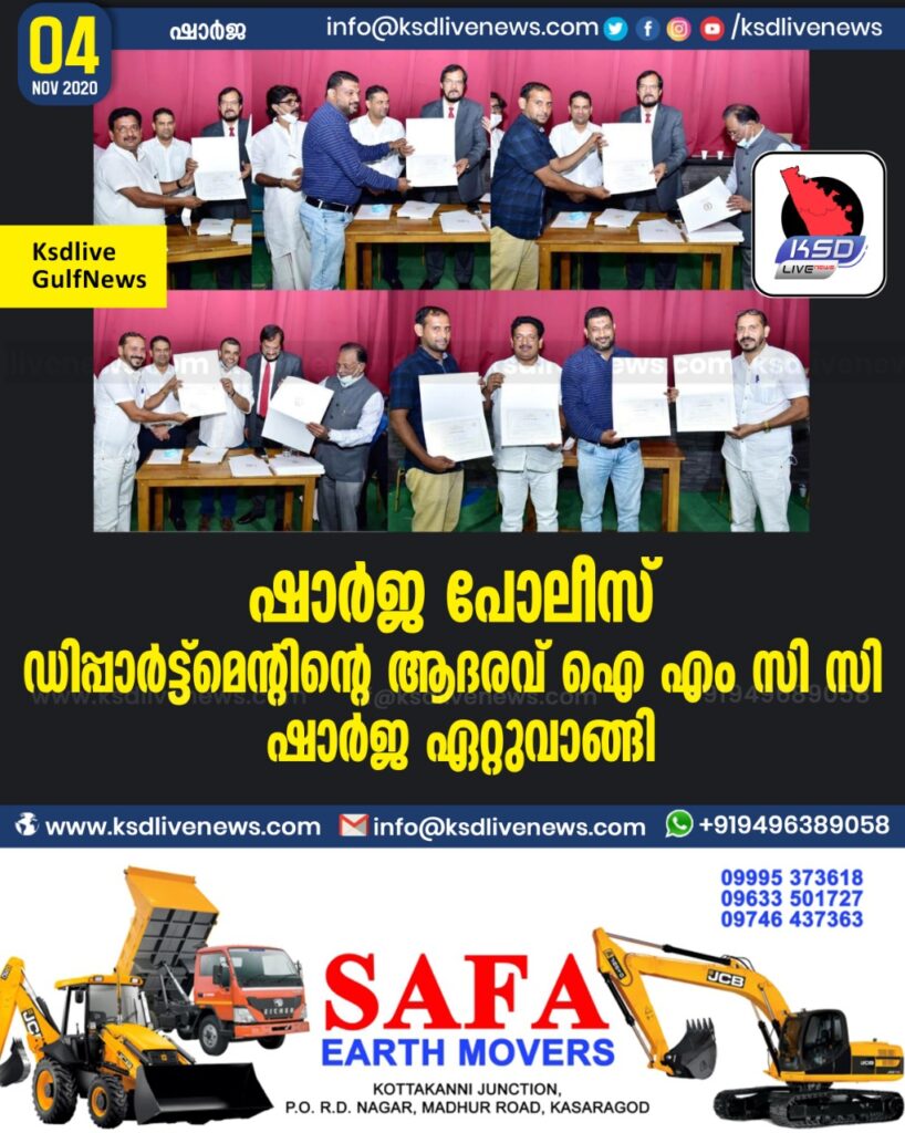 ഷാർജ പോലീസ് ഡിപ്പാർട്ട്മെൻ്റിൻ്റെ ആദരവ് ഐ എം സി സി ഷാർജ ഏറ്റുവാങ്ങി