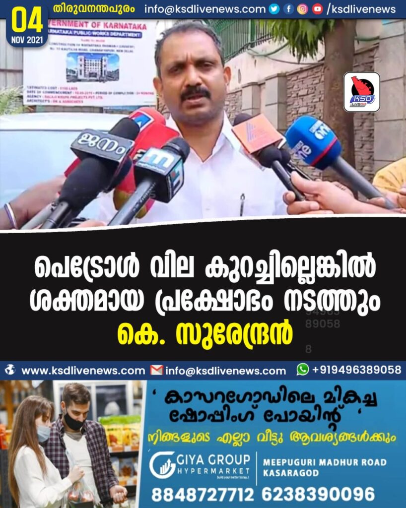 പെട്രോള് വില കുറച്ചില്ലെങ്കില് ശക്തമായ പ്രക്ഷോഭം നടത്തും- കെ. സുരേന്ദ്രന്