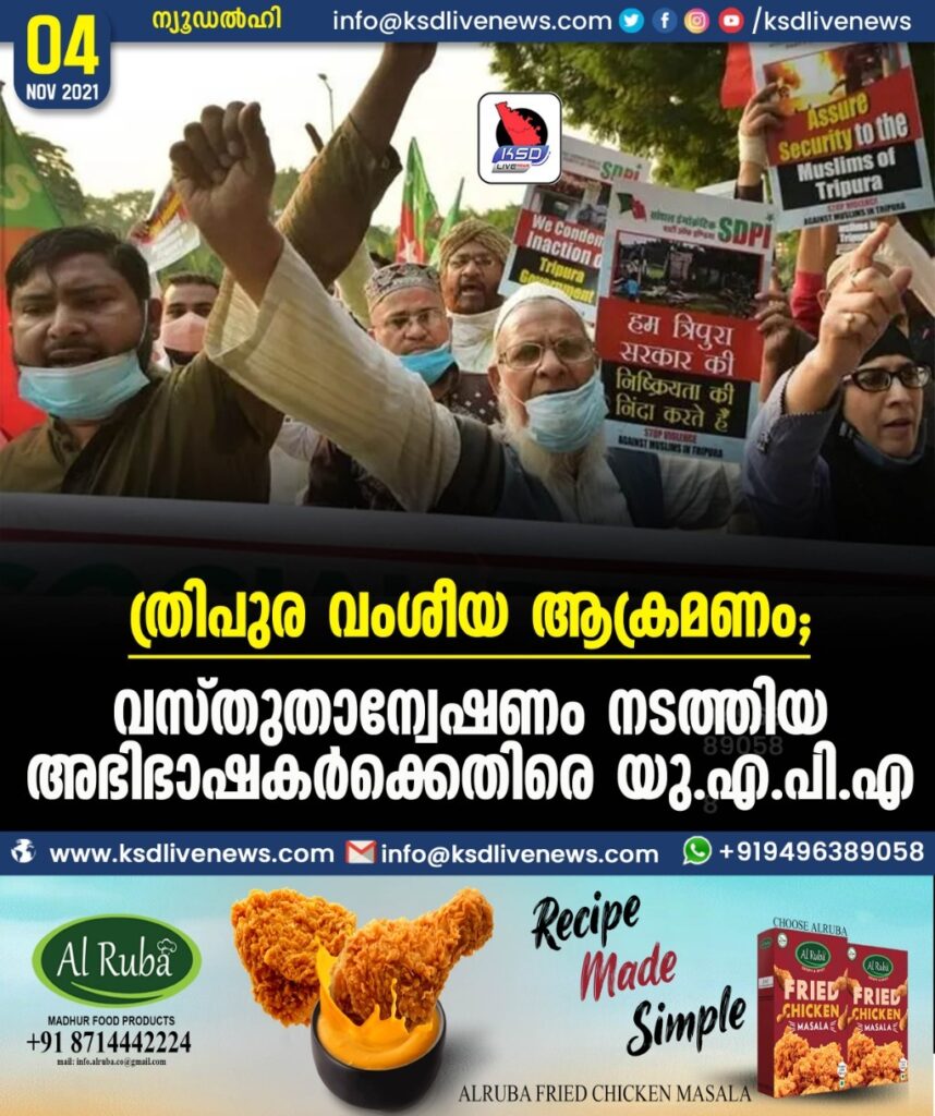 ന്യൂഡല്ഹി: മുസ്ലിംകള്ക്കെതിരെ ത്രിപുരയില് നടന്ന വംശീയ ആക്രമണത്തിൽ വസ്തുതാന്വേഷണ റിപ്പോർട്ട് തയ്യാറാക്കിയ അഭിഭാഷകർെക്കതിരേ യു.എ.പി.എ ചുമത്തി. പൊലീസ് നിഷ്ക്രിയമായാണ് പ്രവര്ത്തിച്ചതെന്നും അക്രമികൾ സഹായകരമായി പെരുമാറിയെന്നും അന്വേഷണ റിപ്പോർട്ട് ചൂണ്ടിക്കാണിച്ചിരുന്നു. അന്വേഷണ സംഘത്തിലുണ്ടായിരുന്ന രണ്ടുപേർക്കെതിരേയാണ് ത്രിപുര പൊലീസ് യു.എ.പി.എ ചുമത്തിയത്. പീപ്പിള്സ് യൂണിയന് ഫോര് സിവില് ലിബര്ട്ടീസിന്റെ (പി.യു.സി.എല്) ദല്ഹി ആസ്ഥാനമായി പ്രവര്ത്തിക്കുന്ന അഭിഭാഷകന് മുകേഷ്, നാഷണല് കോണ്ഫെഡറേഷന് ഓഫ് ഹ്യൂമന് റൈറ്റ്സ് ഓര്ഗനൈസേഷന്സിന്റെ (എന്.സി.എച്ച്.ആര്.ഒ) അഭിഭാഷകനായ അന്സാര് ഇന്ഡോറി എന്നിവര്ക്കെതിരെ യുഎപിഎ 13-ാം വകുപ്പാണ് ചുമത്തിയിരിക്കുന്നത്.