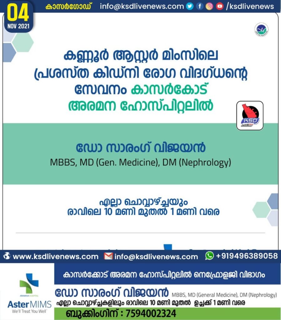 ആസ്റർ മിംസ് ലെ നെഫ്രോളജി(കിഡ്നി രോഗ) വിഭാഗം ഇനി മുതൽ കാസർകോഡ് അരമന ഹോസ്പിറ്റലിൽ എല്ലാ ചൊവ്വാഴ്ചകളിലും