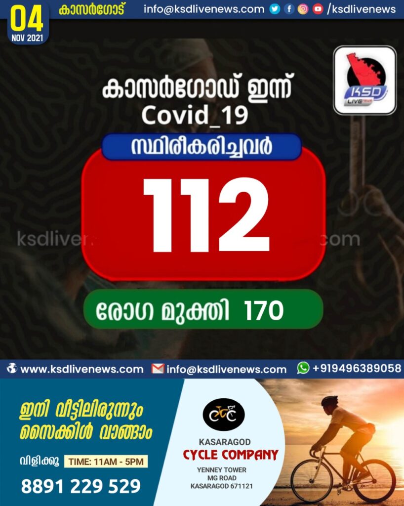 കാസർഗോഡ് ജില്ലയിൽ ഇന്ന് 112 പേർക്ക് കോവിഡ് സ്ഥിരീകരിച്ചു. 170 പേർക്ക് രോഗമുക്തി