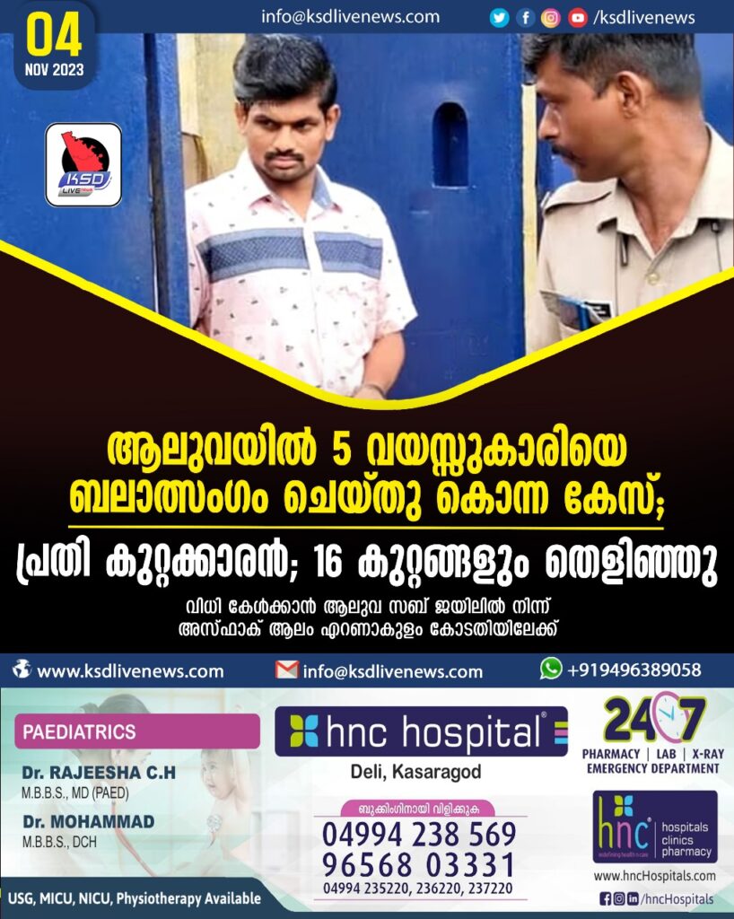 ആലുവയിൽ 5 വയസ്സുകാരിയെ ബലാത്സംഗം ചെയ്തു കൊന്ന കേസ്: പ്രതി കുറ്റക്കാരൻ; 16 കുറ്റങ്ങളും തെളിഞ്ഞു