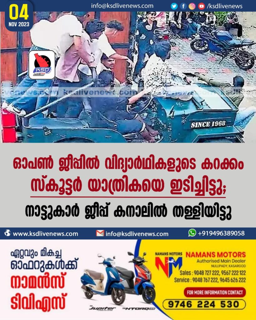 ഓപൺ ജീപ്പിൽ വിദ്യാർഥികളുടെ കറക്കം, സ്കൂട്ടർ യാത്രികയെ ഇടിച്ചിട്ടു; നാട്ടുകാർ ജീപ്പ് കനാലിൽ തള്ളിയിട്ടു