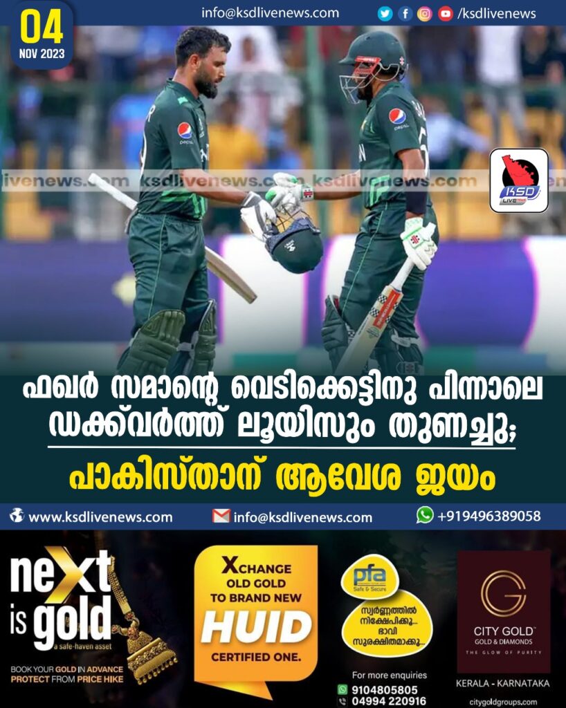 ബെംഗളൂരു: കിവീസിന്റെ ബാറ്റിങ് വെടിക്കെട്ടിന് ഫഖര് സമാന് മറുപടി നല്കിയ മത്സരത്തില് ന്യൂസീലന്ഡിനെതിരേ പാകിസ്താന് ജയം. മഴ കളിമുടക്കിയ മത്സരത്തില് ഡക്ക്വര്ത്ത് ലൂയിസ് നിയമപ്രകാരം 21 റണ്സിനായിരുന്നു പാകിസ്താന്റെ ജയം. പാകിസ്താന്റെ ജയത്തോടെ ദക്ഷിണാഫ്രിക്ക സെമിയില് കടക്കുന്ന രണ്ടാമത്തെ ടീമായി. കിവീസ് ഉയര്ത്തിയ 402 റണ്സെന്ന കൂറ്റന് വിജയലക്ഷ്യത്തിലേക്ക് ബാറ്റെടുത്ത പാകിസ്താന് സെഞ്ചുറി നേടിയ ഓപ്പണര് ഫഖര് സമാന്റെ വെടിക്കെട്ട് ബാറ്റിങ്ങാണ് തുണയായത്. അബ്ദുള്ള ഷഫീഖിനെ (4) രണ്ടാം ഓവറില് തന്നെ നഷ്ടമായെങ്കിലും രണ്ടാം വിക്കറ്റില് ക്യാപ്റ്റന് ബാബര് അസമിനെ കൂട്ടുപിടിച്ച് ഫഖര് വെടിക്കെട്ടിന് തിരികൊളുത്തി. ഇതിനിടെ 21.3 ഓവറില് പാകിസ്താന് ഒന്നിന് 160 റണ്സില് നില്ക്കെയാണ് ആദ്യം മഴ കളി തടസപ്പെടുത്തുന്നത്. സമയം നഷ്ടമായതോടെ പാകിസ്താന്റെ വിജയലക്ഷ്യം 41 ഓവറില് 342 റണ്സായി പുനര്നിശ്ചയിച്ചു. ആ സമയം ഡിഎല്എസ് പാര് സ്കോറിനേക്കാള് 10 റണ്സിന് മുന്നിലായിരുന്നു പാകിസ്താന്. കളിപുനരാരംഭിച്ച ശേഷം സ്കോര് 25.3 ഓവറില് ഒന്നിന് 200 റണ്സെന്ന നിലയില് നില്ക്കേ വീണ്ടും മഴയെത്തി. കളി തുടരാനാകില്ലെന്ന് വിലയിരുത്തപ്പെട്ടതോടെ പാകിസ്താനെ വിജയികളായി പ്രഖ്യാപിക്കുകയായിരുന്നു. ലോകകപ്പില് ഒരു പാകിസ്താന് താരത്തിന്റെ വേഗമേറിയ സെഞ്ചുറി കുറിച്ച ഫഖര് സമാന് 81 പന്തില് നിന്ന് 11 സിക്സും എട്ട് ഫോറുമടക്കം 126 റണ്സോടെ പുറത്താകാതെ നിന്നു. താരത്തിന് ഉറച്ച പിന്തുണ നല്കിയ ബാബര് 63 പന്തില് നിന്ന് ആറ് ഫോറും രണ്ട് സിക്സുമടക്കം 66 റണ്സെടുത്തു. ഇരുവരും ചേര്ന്ന് രണ്ടാം വിക്കറ്റില് 194 റണ്സിന്റെ കൂട്ടുകെട്ടുണ്ടാക്കി. ജയത്തോടെ എട്ട് മത്സരങ്ങളില് നിന്ന് എട്ടു പോയന്റ് നേടിയ പാകിസ്താന് അഞ്ചാം സ്ഥാനത്തെത്തി. സെമി പ്രതീക്ഷ നിലനിര്ത്താനും ടീമിനായി.