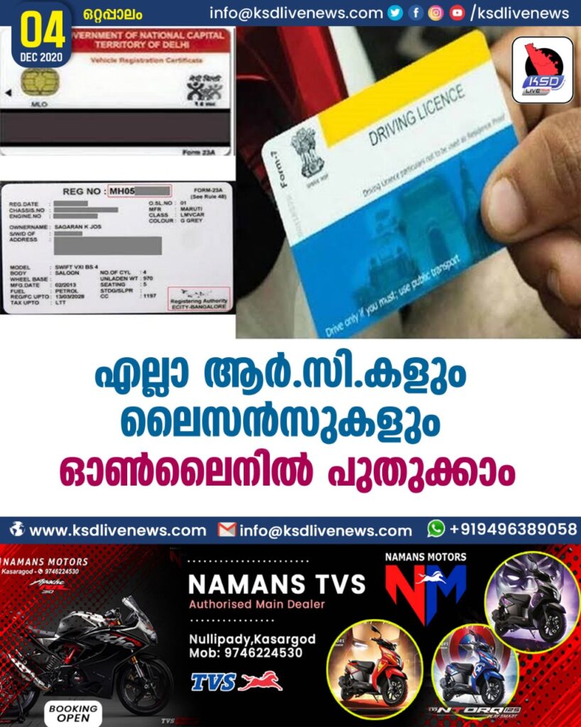 എല്ലാ ആര്.സി.കളും ലൈസന്സുകളും ഓണ്ലൈനില് പുതുക്കാം