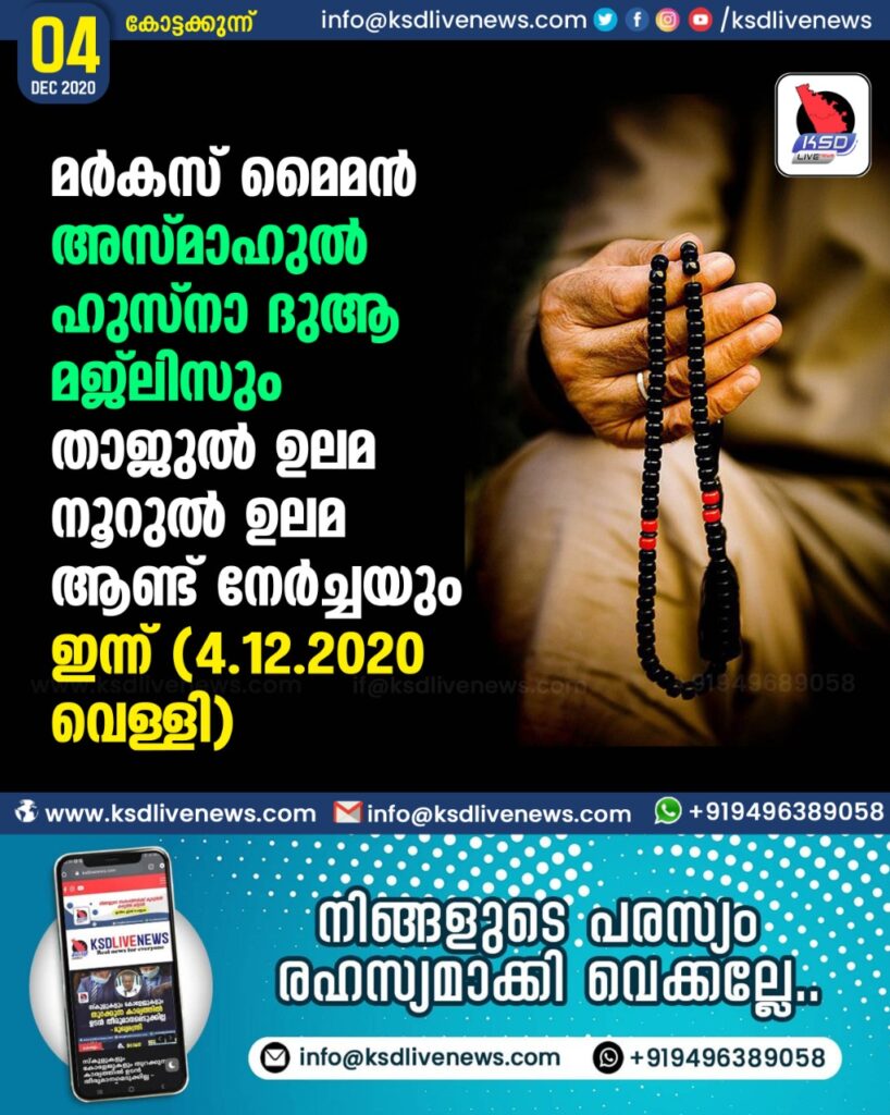 മർകസ് മൈമൻ അസ്മാഹുൽ ഹുസ്നാ ദുആ മജ്ലിസും താജുൽ ഉലമ നൂറുൽ ഉലമ ആണ്ട് നേർച്ചയും ഇന്ന് (4-12-2020 വെള്ളി)