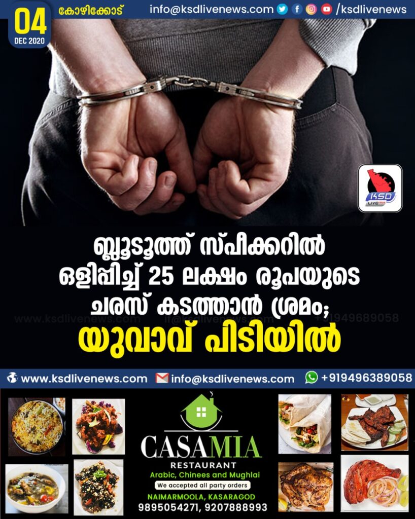 ബ്ലൂടൂത്ത് സ്പീക്കറിൽ ഒളിപ്പിച്ച് 25 ലക്ഷം രൂപയുടെ ചരസ് കടത്താൻ ശ്രമം ; യുവാവ് പിടിയിൽ