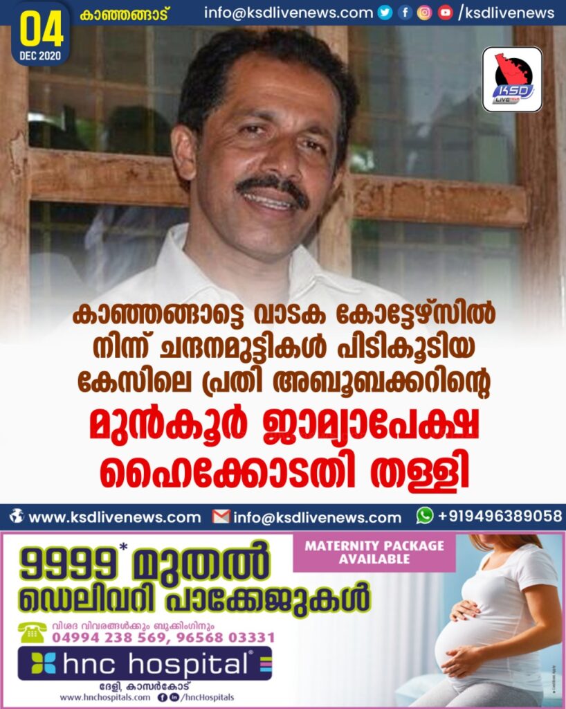കാഞ്ഞങ്ങാട്ടെ വാടക കോട്ടേഴ്സിൽ നിന്ന് ചന്ദനമുട്ടികൾ പിടികൂടിയ കേസിലെ പ്രതി അബൂബക്കറിന്റെ മുൻകൂർ ജാമ്യാപേക്ഷ ഹൈക്കോടതി തള്ളി
