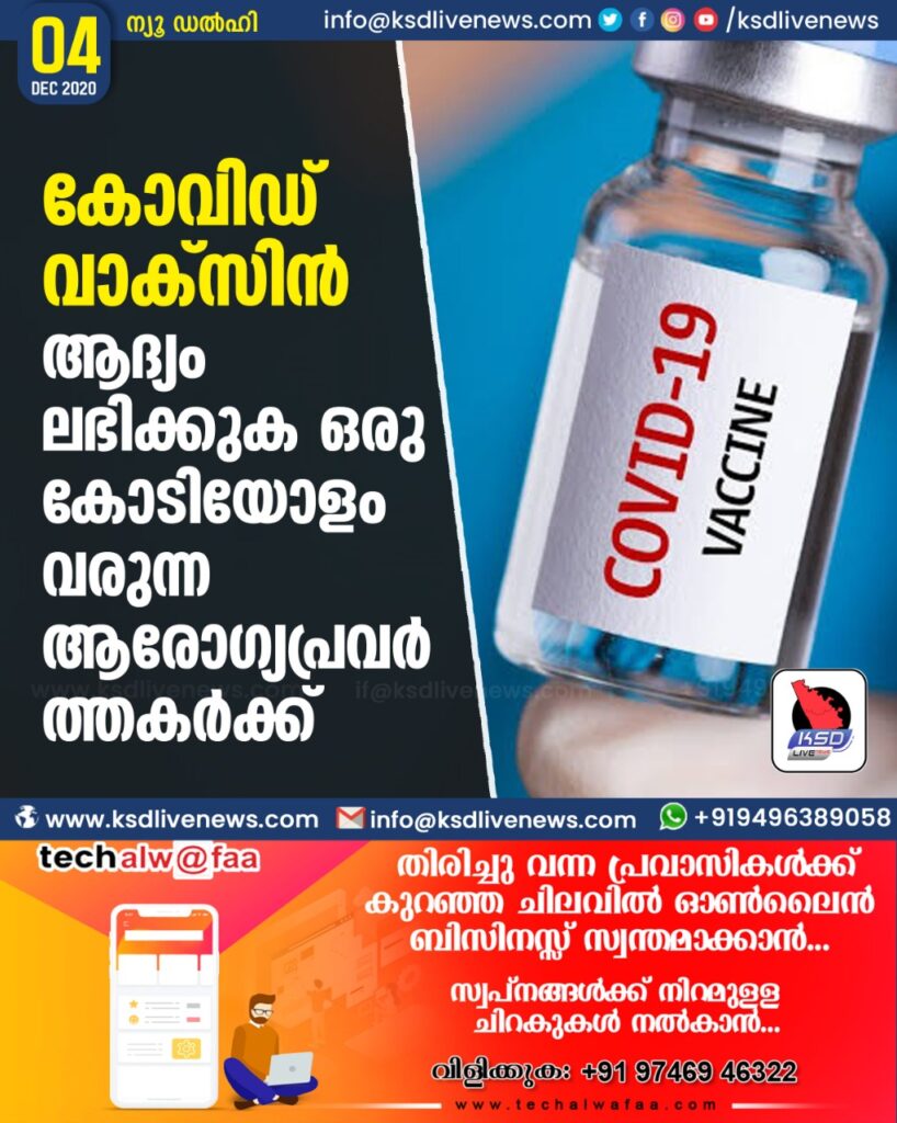 കോവിഡ് വാക്സിന് ആദ്യം ലഭിക്കുക ഒരു കോടിയോളം വരുന്ന ആരോഗ്യപ്രവര്ത്തകര്ക്ക്