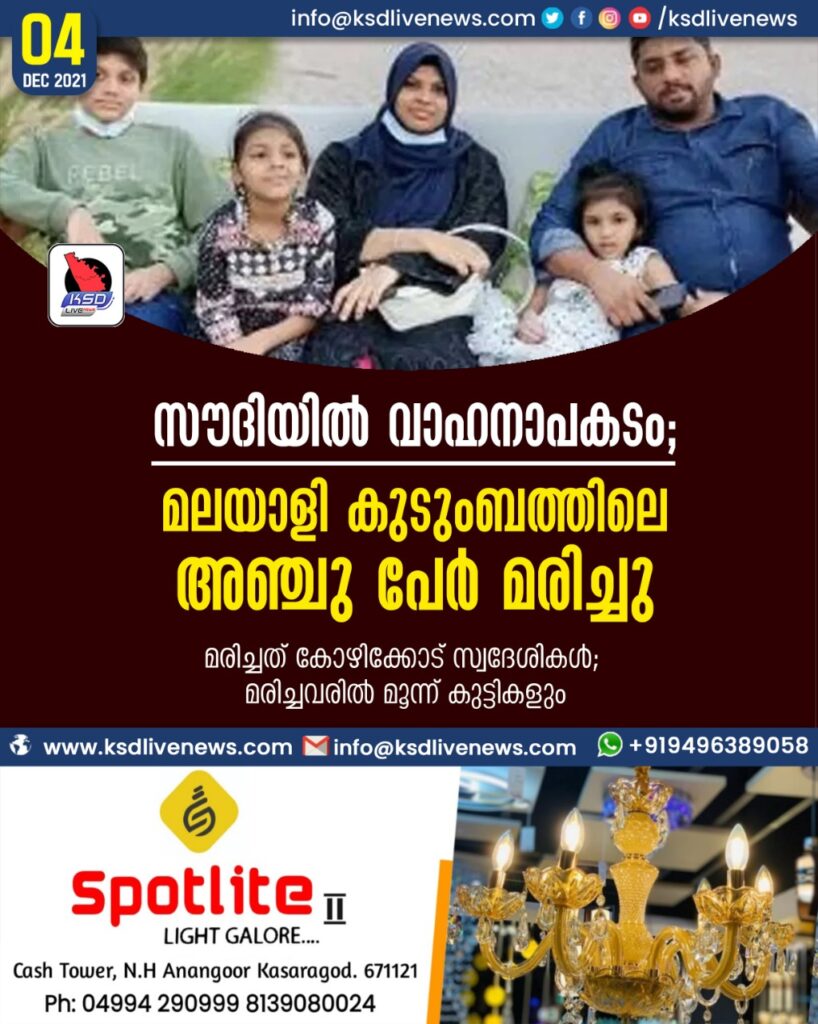 ജുബൈലിൽ നിന്ന് ജിസാനിലേക്കുള്ള യാത്രക്കിടയിൽ റിയാദിൽ നിന്നും 200 കിലോമീറ്റർ അകലെയുള്ള അൽ റെയ്ൻ എന്ന സ്ഥലത്ത് വെച്ച് ശനിയാഴ്ച പുലർച്ചെ ഇവർ സഞ്ചരിച്ച കാറിന് പിറകിൽ സ്വദേശി പൗരന്റെ ലാൻറ് ക്രൂയിസർ കാർ ഇടിച്ചു കയറിയായിരുന്നു അപകടം. അഞ്ചുപേരും സംഭവസ്ഥലത്ത് വെച്ചു തന്നെ മരിച്ചതായാണ് വിവരം.