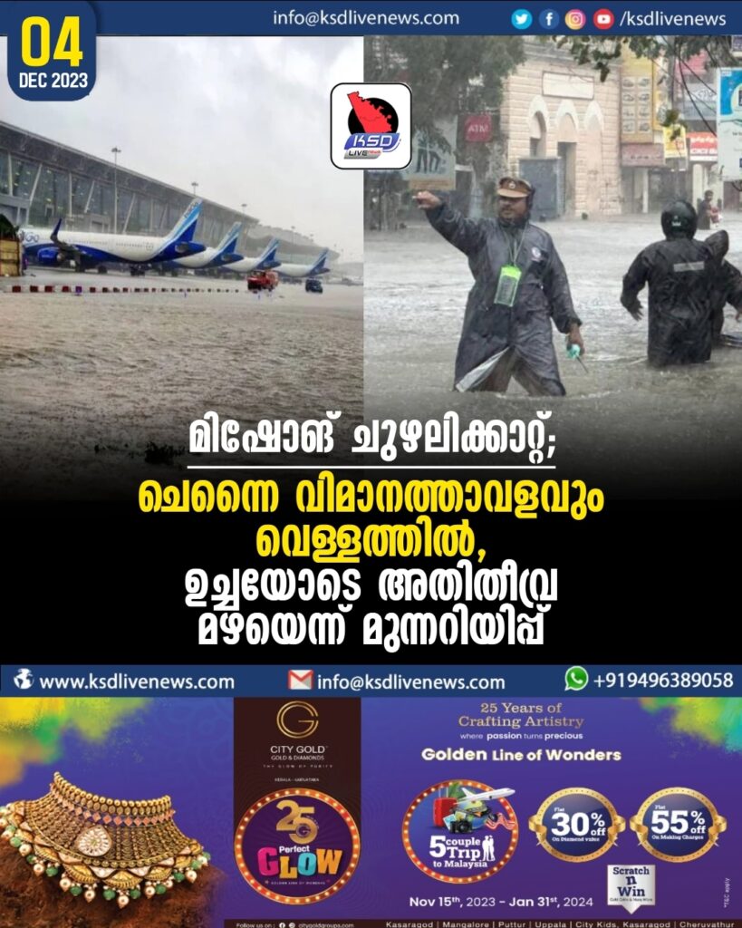 മിഷോങ് ചുഴലിക്കാറ്റ്; ചെന്നൈ വിമാനത്താവളവും വെള്ളത്തിൽ, ഉച്ചയോടെ അതിതീവ്ര മഴയെന്ന് മുന്നറിയിപ്പ്,