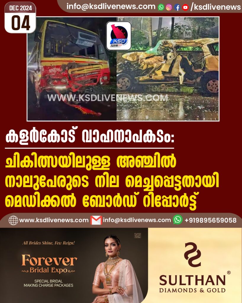 കളർകോട് വാഹനാപകടം: ചികിത്സയിലുള്ള അഞ്ചിൽ നാലുപേരുടെ നില മെച്ചപ്പെട്ടതായി മെഡിക്കൽ ബോർഡ് റിപ്പോർട്ട്