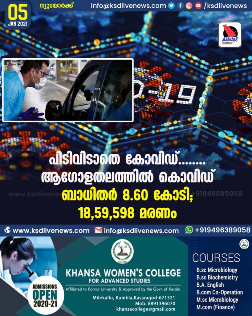 ആഗോളതലത്തിൽ കൊവിഡ് ബാധിതർ 8.60 കോടി; 18,59,598 മരണം