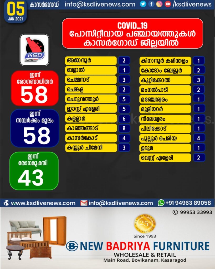 കാസർഗോഡ് ജില്ലയിൽ ഇന്ന് കോവിഡ് സ്ഥിരീകരിച്ചവരുടെ പഞ്ചായത്ത് തിരിച്ചുള്ള സ്ഥിതി വിവര കണക്ക്