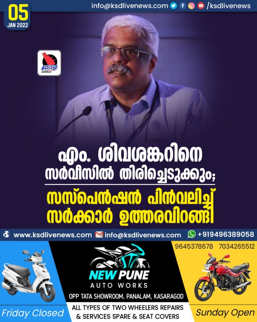 എം. ശിവശങ്കറിനെ സർവീസില്‍ തിരിച്ചെടുക്കും; സസ്പെന്‍ഷന്‍ പിന്‍വലിച്ച് സർക്കാർ ഉത്തരവിറങ്ങി