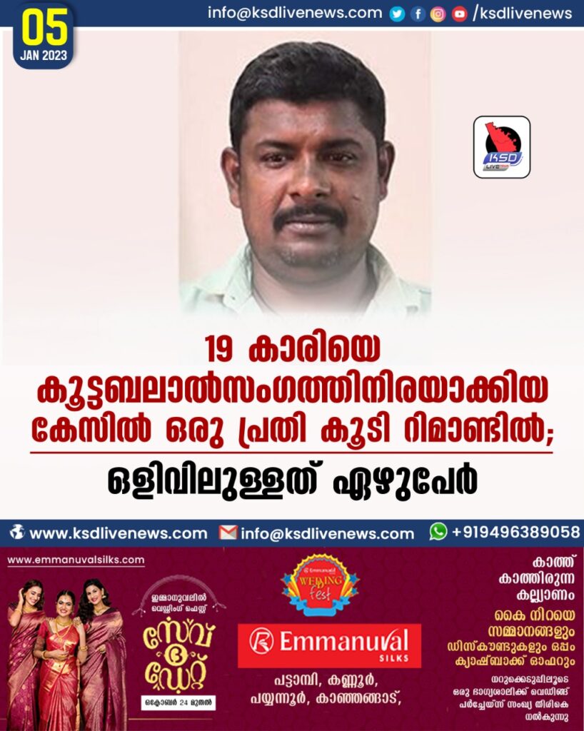 19 കാരിയെ കൂട്ടബലാല്സംഗത്തിനിരയാക്കിയ കേസില് ഒരു പ്രതി കൂടി റിമാണ്ടില്; ഒളിവിലുള്ളത് ഏഴുപേര്